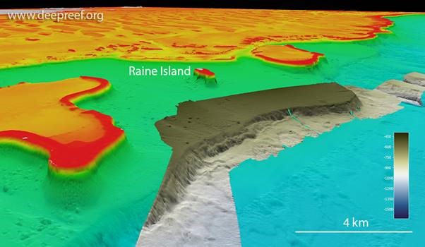 An 18 km long by 5 km wide section of a deep platform was mapped to seaward of Raine Island, one of eight 300-500 m tall detached reefs, by adding to the previous mapping efforts by the Schmidt Ocean Institute’s RV Falkor in 2020/21. This deep ledge, now 100% mapped, and the steep scarp that drops into the adjacent basin, helps to explain the growth positions of these unusual detached reefs and their long growth history over geological time.